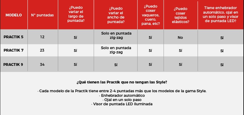 · 23 puntadas para todo tipo de labores: Ojal automático en 1 paso, Básicas, Decorativas, Festones, Superautomáticas, Zig-zag.