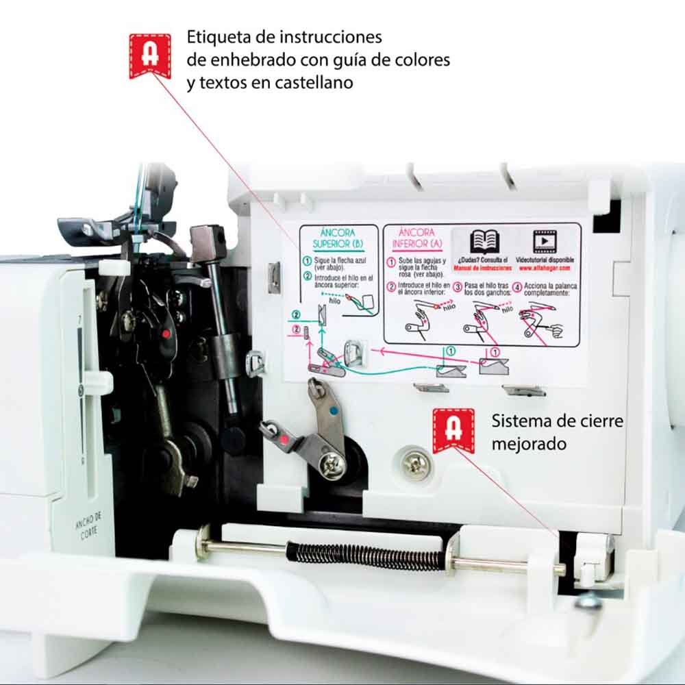 - Etiqueta de instrucciones de enhebrado mediante guías de colores y textos en castellano.