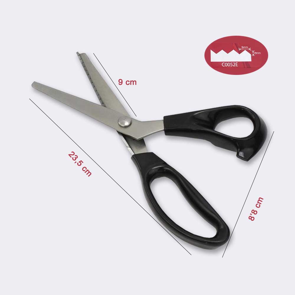 Tijera de zig-zag de acero inoxidable con mango ergonómico en color negro.